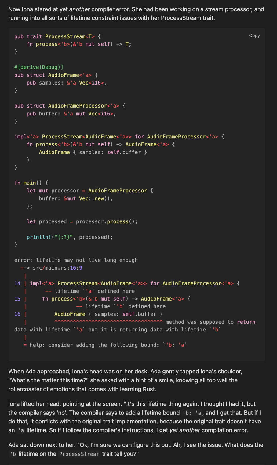 Iona battles the compiler, coming to understand Lifetimes in Traits more deeply.