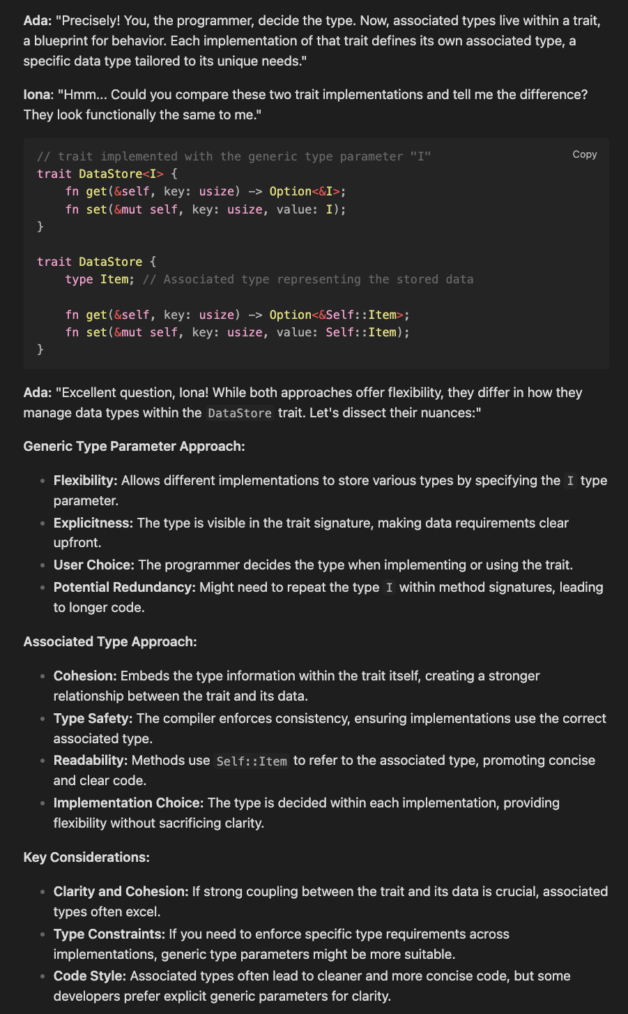 Iona dives into practical examples with Ada as her mentor, showcasing how traits drive real-world Rust development. Master generics, associated types, trait bounds, lifetimes, and the dynamic behavior traits unlock.