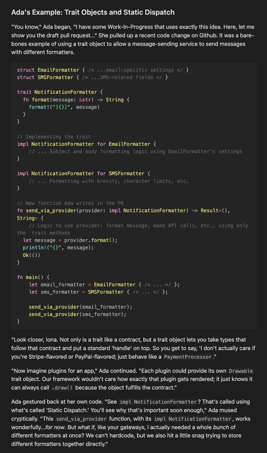Iona joins ForgeStone, ready to unlock the secrets of Rust. Traits, she discovers, are the heart of its unique expressiveness and safety. They define behaviors types can implement, enabling powerful abstractions and adaptable code.
